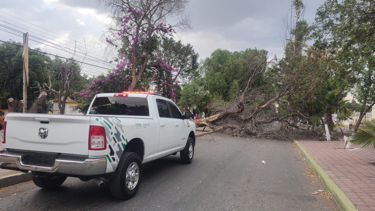Personal de Protección Civil Estatal en conjuntos con PC de la Capital y de Soledad apoyaron en el retiro de árboles.